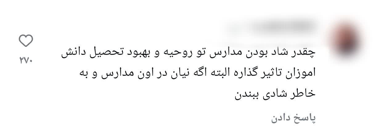 این اقدام آنگونه که از کامنتهای فضای مجازی اینستاگرام برداشت میشود ظاهراً برای سرگرمی و شادی دانشآموزان صورت گرفته است پخش چنین محتوایی در محیط آموزشی نشاندهندۀ انحراف از اهداف تربیتیای است که آموزش و پرورش را به عنوان پایهگذار آیندۀ جامعه تعریف میکند. این اتفاق ضرورت نظارت دقیق بر برنامههای آموزشی و بازنگری در تربیت فرهنگی مدارس را بیش از پیش آشکار میسازد تا از تکرار چنین کجرفتارهایی جلوگیری شود و روز دانشآموز به جای ابزار انحراف به فرصتی واقعی برای تربیت و آموزش نسلی هشیار و آگاه تبدیل گردد.
