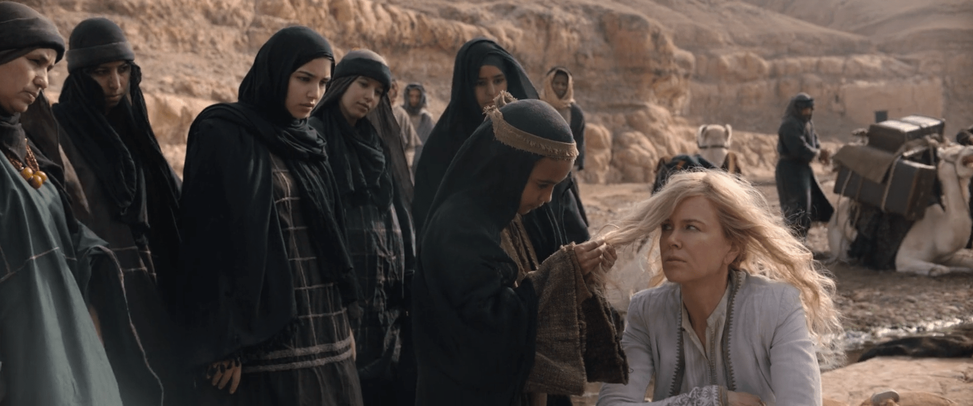 این قاب از فیلم ملکۀ صحرا رویارویی دو جهان را از دریچۀ نگاه هالیوود نسبت به اسلام به تصویر میکشد. در یک سو گرترود بل به عنوان نمایندۀ زن تحصیلکرده و مستقل بریتانیایی قرار دارد که با اعتماد به نفس در سرزمینی بیگانه حضور یافته است. در سوی دیگر گروهی از زنان جوان با حجاب ایستادهاند.